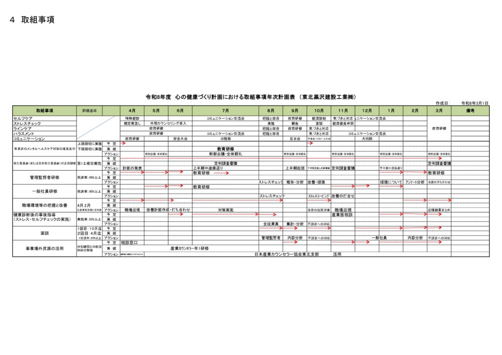 本年も引き続き快適な職場環境形成に向けて、心の健康づくりに向けた計画を立てて実行してまいります。